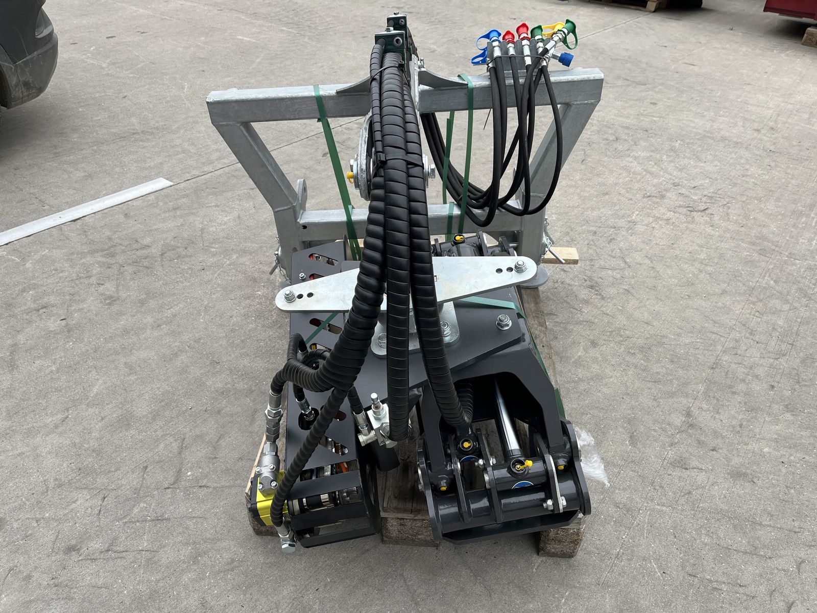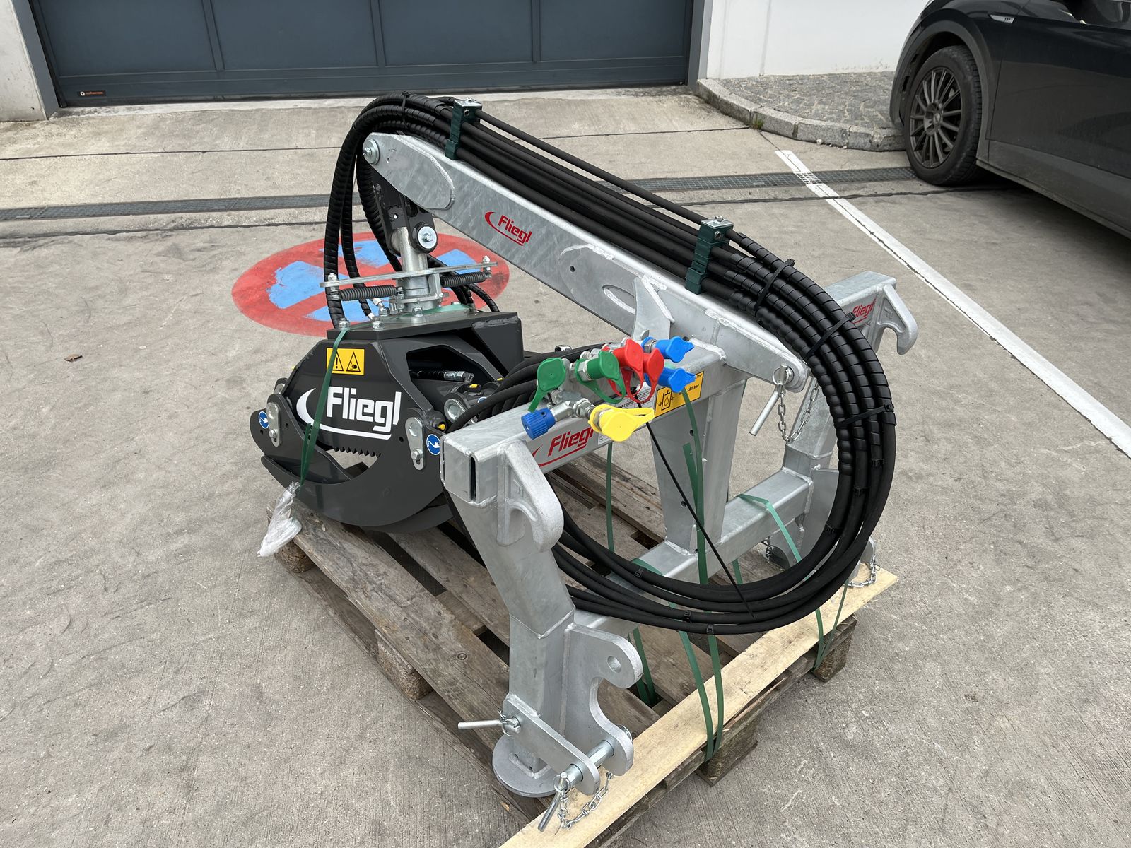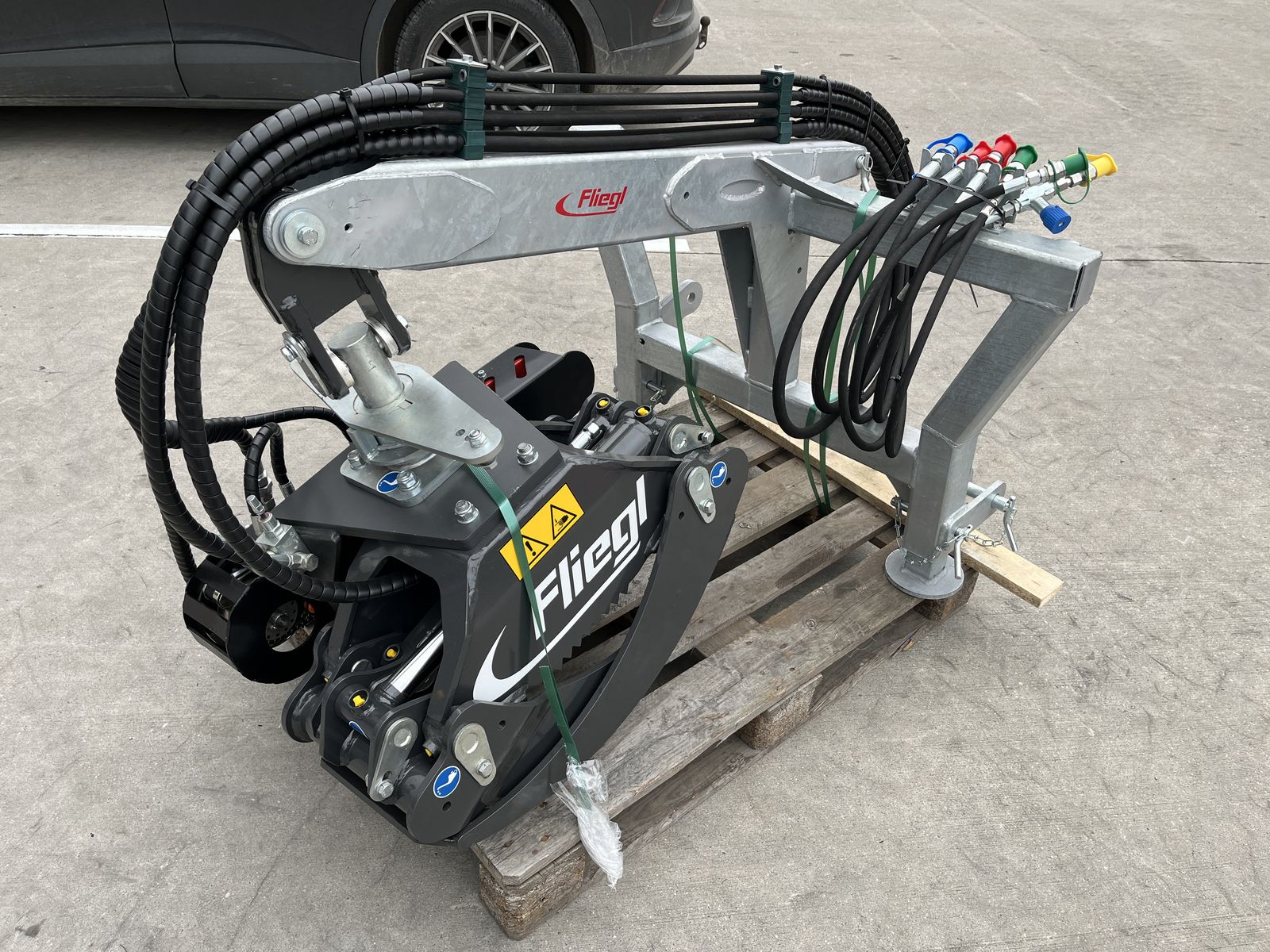 Hier wird eine Neuentwicklung von Fliegl angeboten, die Verladezange VZ 130 Combi Cut mit Harvesteraggregat und Euro und Dreipunktaufnahme.